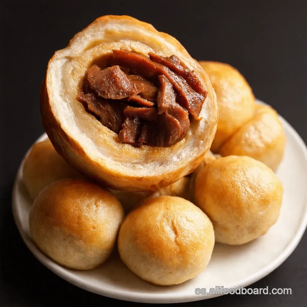 ¡Un Baked Char Siu Bao (Chinese BBQ Pork Bun) es como un "bocadillo" chino al horno! Es un panecillo relleno de cerdo Char Siu, que es cerdo asado con un sabor dulce y salado muy característico. El pan es suave y ligeramente dulce, creando un contraste delicioso.