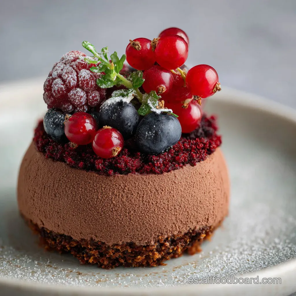 La vista es el primer sentido que disfruta de un dulce. Al ser un postre oscuro, las decoraciones que aporten luz o color son tus mejores aliadas. Unas frambuesas frescas aportan una acidez necesaria que corta la grasa del mascarpone.